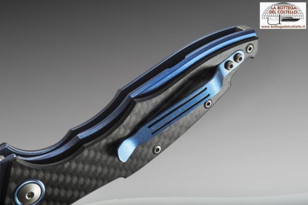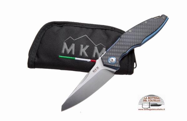 Questo è MK VP01-CF Raut fibra di carbonio, front flipper - Caratteristiche pubblicate dal produttore: lunghezza lama 85 mm - Spessore lama 4 mm - Lunghezza totale 204 mm - Peso: 130 gr - Manico: frame in titanio Gr.5Ti6AI4V anodizzato blu, guancette in fibra di carbonio - Acciaio lama: Bohler M390 Microclean, HRC 58-60 - Accessori: astuccio in materiale sintetico con chiusura lampo e passacintura. Confezione: scatola di cartone.