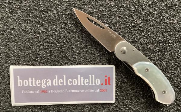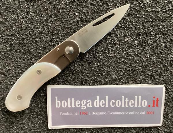 Versione del modello 118 Elan con guancette dell'impugnatura in Madreperla. Lunghezza totale aperto mm.117 chiuso mm.70 lama mm.48 prodotto nel 2004