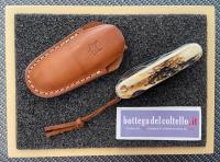 Guancette in corno di cervo con rivetti in ottone, spessore massimo del manico 25 mm, lunghezza manico 96 mm larghezza massima del manico 30 mm. peso del coltello 128 grammi