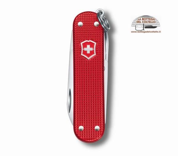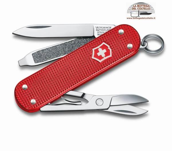 Strumenti: lama, forbici, lima per unghie, cacciavite 2,5 mm, anello portachiavi. Dimensioni: Altezza 6 mm - Lunghezza 58 mm - Peso 17 g. Guancette: ALOX di alta qualità. Confezione: scatola di cartoncino.