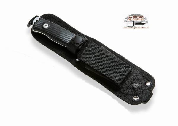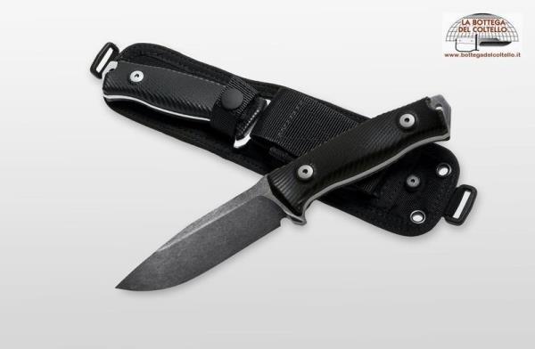 Specifiche tecniche pubblicate dal produttore: Lunghezza totale: 241 mm. - 9.49 in. - Lunghezza lama: 115 mm. - 4.53 in. - Spessore lama: 4.5 mm. - 0.18 in. - Peso totale: 350 gr. - 12.35 oz. - Acciaio lama: Acciaio inossidabile Sleipner - Finitura lama: Nera (PVD + Stone Washed) - Materiale manico: G10 - Colore manico: Nero - Fodero: Cordura - Imballo: Scatola di cartone. Le viti sono in acciaio inox con sistema di serraggio Torx T8.