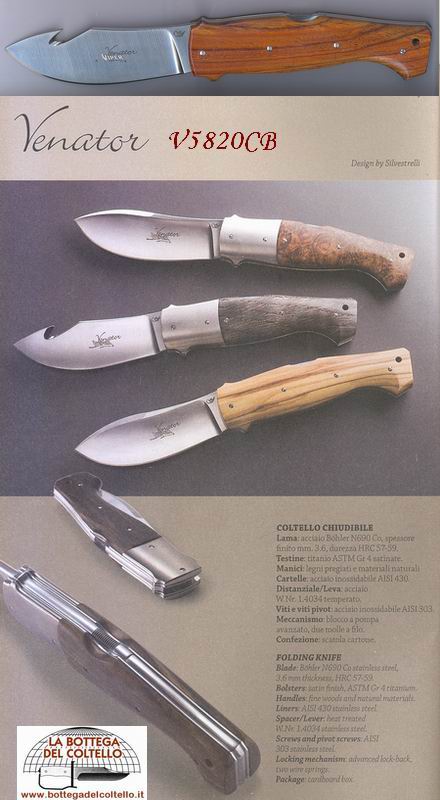 Viper Tecnocut Italia articolo V5820CB Coltello chiudibile sventratore, cocobolo. Venator, design di Fabrizio Silvestrelli. Innovativo sistema di sblocco a pompa.
