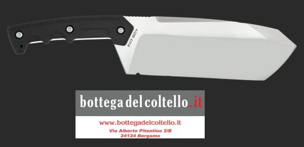Il dorso, spesso e piatto nella parte terminale, conferisce allo strumento una maggior massa e superficie battente utile per martellare e piantare picchetti. Fat Boy ha un manico composto da 2 guancette in materiale G10 di colore nero realizzate con il nuovo design originale Extrema Ratio. Amovibili e sostituibili, permettono di effettuare ispezioni e controlli sotto la manicatura e consentono il montaggio del paracord.