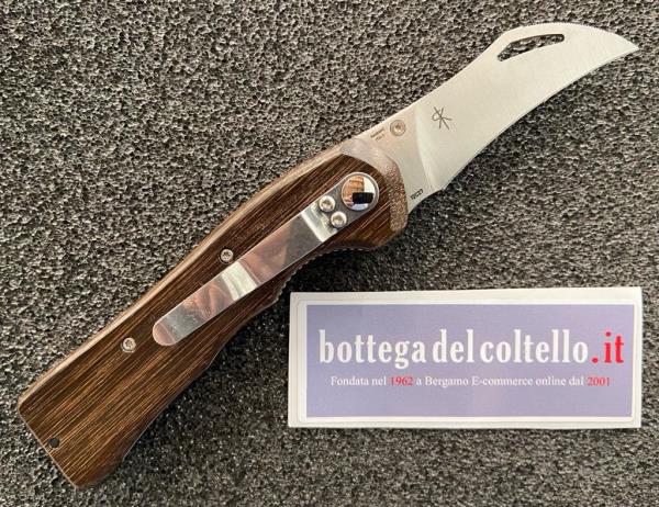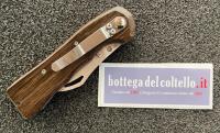 Fox Spora 409, coltello per raccolta funghi disegnato da Riccardo Gobbato, realizzato a Maniago. Liner lock con clip e pennellino, manico in legno Eucaliptus