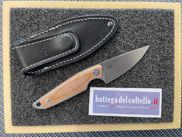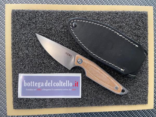 MKM MAKRO 1 natural micarta. Makro, design di Jesper Voxnaes, è un fratello maggiore di Mikro. È una lama fissa compatta, ma di grandi prestazioni, acciaio M390 guancette in micarta natural.
