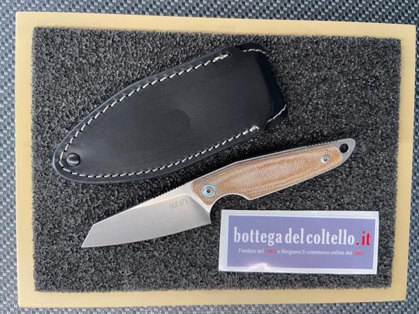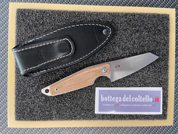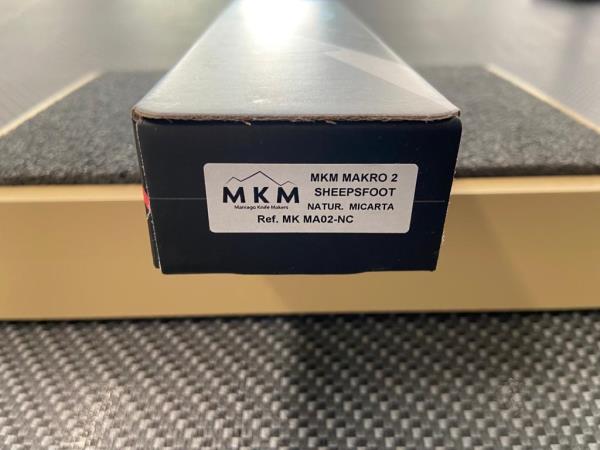 MKM MAKRO 2 natural canvas micarta. Makro, design di Jesper Voxnaes, è un fratello maggiore di Mikro. È una lama fissa compatta, ma di grandi prestazioni, acciaio M390 guancette in canvas micarta naturale.