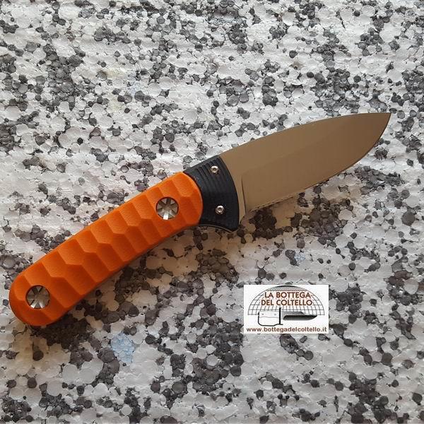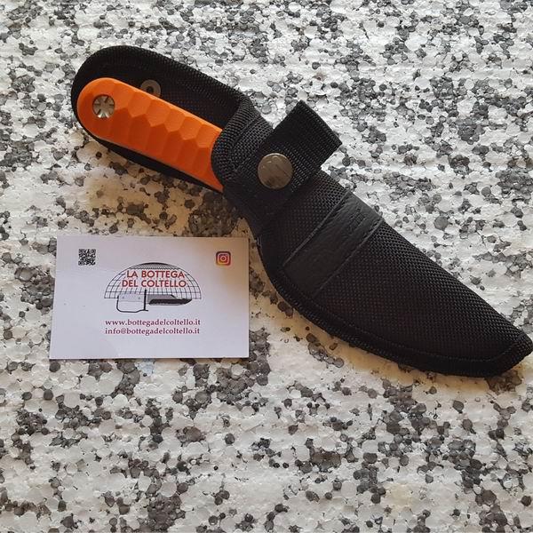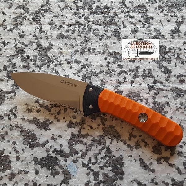 Art. 975G10AN Design by Coltellerie Maserin - Lama parzialmente seghettata - Scheda tecnica pubblicata dal produttore: Materiale lama: Acciaio AISI 440C (finitura satinata) 85mm HRC 58/60 - Lunghezza totale: 190 mm - Manico: G10 arancio e nero - Fodero: Nylon - Peso: 150gr - Spessore lama: 3,5 mm - Accessori: Tesoretto.
