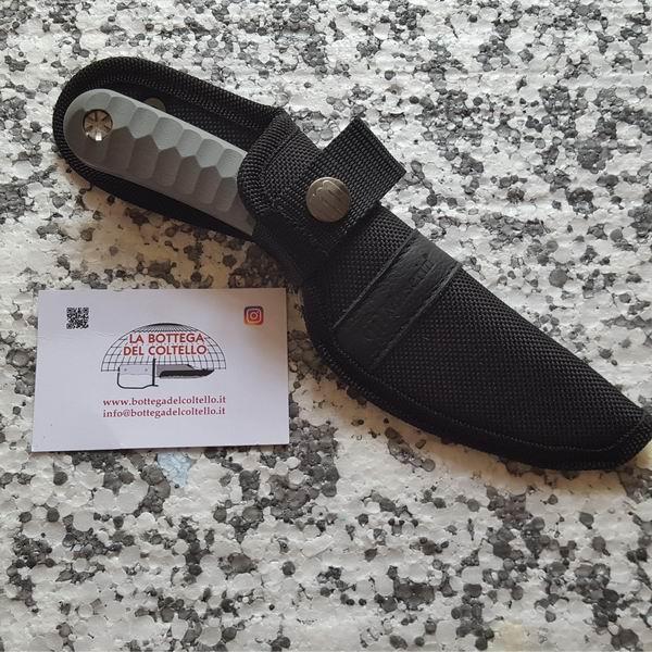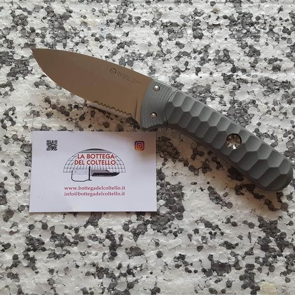 Art. 975G10G Design by Coltellerie Maserin - Lama parzialmente seghettata - Scheda tecnica pubblicata dal produttore: Materiale lama: Acciaio AISI 440C (finitura satinata) 85mm HRC 58/60 - Lunghezza totale: 190 mm - Manico: G10 grigio - Fodero: Nylon - Peso: 150gr - Spessore lama: 3,5 mm - Accessori: Tesoretto.