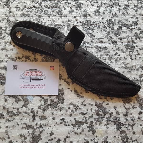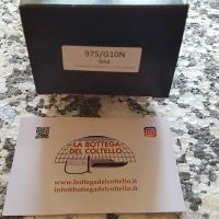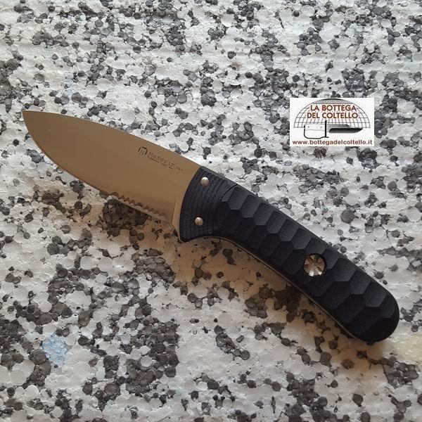 Art. 975G10N Design by Coltellerie Maserin - Lama parzialmente seghettata - Scheda tecnica pubblicata dal produttore: Materiale lama: Acciaio AISI 440C (finitura satinata) 85mm HRC 58/60 - Lunghezza totale: 190 mm - Manico: G10 nero - Fodero: Nylon - Peso: 150gr - Spessore lama: 3,5 mm - Accessori: Tesoretto.