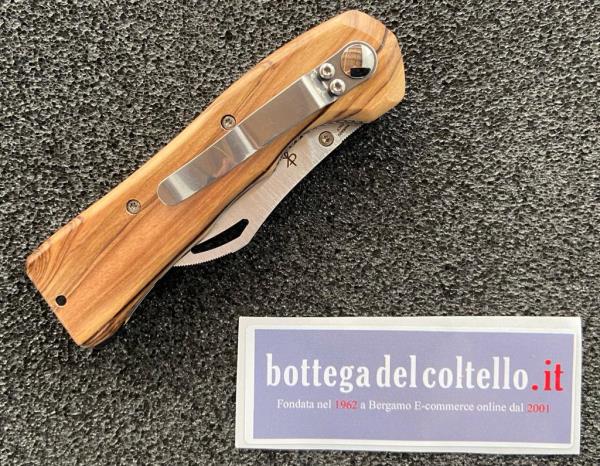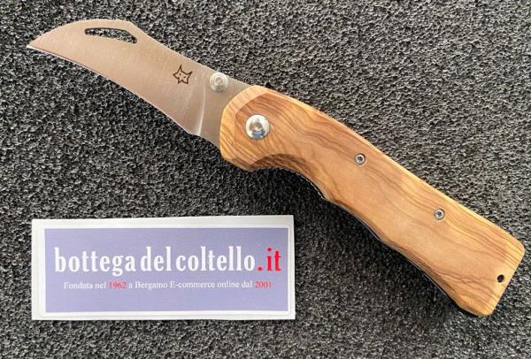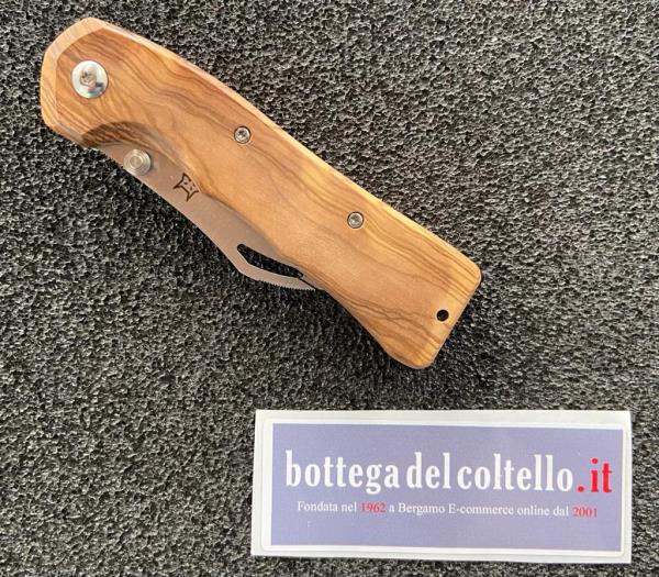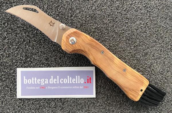 Spora Fox 409OL coltello per funghi disegnato da Riccardo Gobbato, realizzato a Maniago. Liner lock con clip e pennellino, manico in legno di olivo