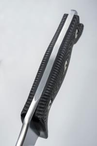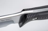 E' stato quindi rispolverato un vecchio progetto sviluppato alcuni anni fa con Molletta (Carthago prodotto in serie limitata) e con le dovute modifiche è stato rimesso in produzione. Manico in Micarta Solid® lavorato con un centro di lavoro a quattro assi, lama satinata. Acciaio non inox: Sleipner Uddeholm. Lunghezza totale mm 315, lama mm 180, spessore mm 5.5. Peso gr 407. Fodero: cordura + kydex.