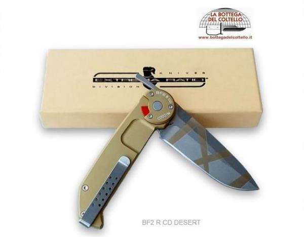 Extrema Ratio Italia. Il modello BF2 R mantiene tutte le caratteristiche del BF2, aggiornato con il nuovo sistema di apertura high speed Razor opening. Disponibile nelle versioni BF2 R Classic Tanto BLACK, Classic Tanto STONE WASHED, Classic Tanto DESERT, Classic Drop BLACK, Classic Drop STONE WASHED, Classic Drop DESERT.