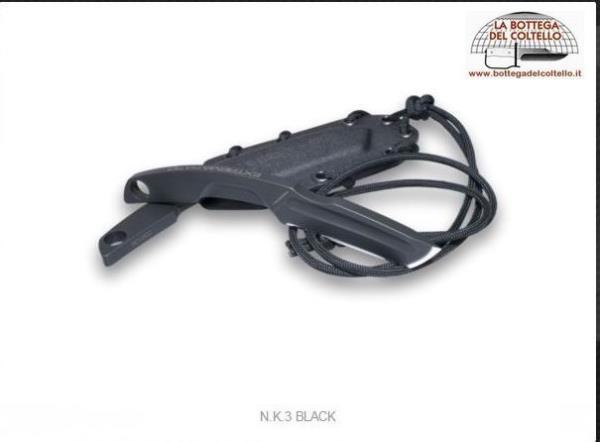 Si differenzia dai modelli N.K.1 e N.K.2 per la dimensione maggiore della lama tanto da 70mm, dotata di fresatura scolasangue. L’ergonomia dell’impugnatura è studiata così da evitare tagli accidentali durante l’estrazione dal fodero. Sul dorso è ricavato uno scarico per il posizionamento del dito pollice o indice a seconda dell’utilizzo. La struttura consente l’utilizzo per colpi da taglio molto efficaci oppure per piccoli lavori di precisione. Il fodero in Kydex è a sgancio rapido ed è fornito di paracord per il porto del coltello al collo. Disponibile nelle versioni N.K.3 BLACK, NK 3 DESERT WARFARE, N.K.3 STONE WASHED.