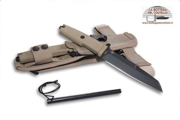 Extrema Ratio Task J coltello multiruolo dotato di doppia guardia per evitare lo scivolamento accidentale della mano sulla lama. Viene fornito con fodero standard in colore desert con innesto automatico del coltello, pattella e cinghia cosciale per il fissaggio al fianco. In esso è alloggiato un acciarino collegato al fodero con un laccio di sicurezza.