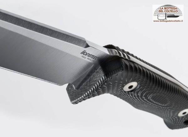 Lionsteel T5 è un coltello fisso con lama satinata in acciaio Niolox e manico in micarta ottenuto in fresatura da un singolo pezzo.