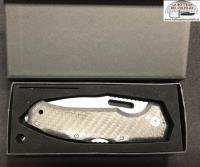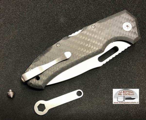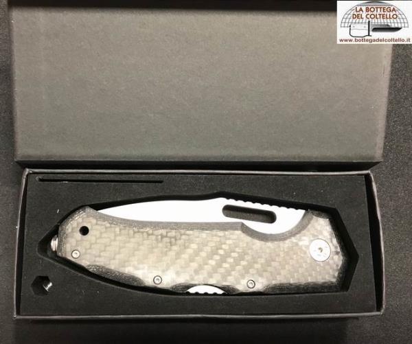 Art. 480/CN Coltello pieghevole, molto robusto e allo stesso tempo leggero, comodo da portare e da usare, facile apertura a una mano. In dotazione una chiave per sostituire il frangivetro e mettere una vite piatta. Rumici design. Caratteristiche tecniche fornite dal produttore: Lama: Acciaio inox Böhler M390 HRC 60 (finitura Stonewashed) da 95 mm. Lunghezza totale: 222 mm. Peso: 140 gr~. Sistema di apertura: a pompa Lock-Back. Manico: FIBRA DI CARBONIO. Accessori: Rompivetro. Clip: Acciaio. Confezione: scatola di cartoncino nero.