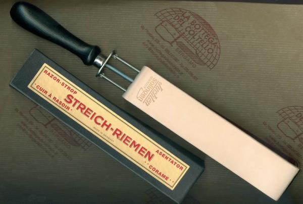 Herold Coramella da tavolo 56 J, con pasta su un lato, per rifinire o ravvivare il tagliente dei rasoi a lama libera. Solingen Germania. Eventuali paste aggiuntive devono essere acquistate separatamente.
