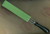 Articolo HS-56-J Manico tensionatore con coramella in cuoio russo e pasta verde sull'altro lato. Dimensioni: lunghezza totale 330 mm, coramella mm 185 x 40.
