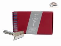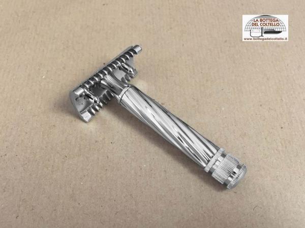 Fatip Premana Art. 42138 Rasoio di sicurezza. Realizzato con la classica finitura cromata con testina originale (pettine aperto), lo Storto Chrome Originale presenta anche un design del manico altrettanto particolare con un motivo a corde oblique che richiamano il concetto del rasoio e garantiscono una presa sicura. Peso: 67 g / Lunghezza Totale – 85 mm / Lunghezza Manico – 75 mm / Larghezza Testina – 23 mm. Confezione: scatola di cartoncino.