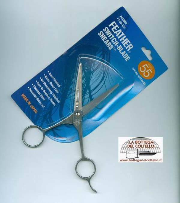 Feather #433000 F1-05-155 switch-blade shears Forbici per parrucchieri, lame sostituibili. Prodotto giapponese. Confezione: come da immagine. Lame sostitutive: Feather shear blades 50/55 disponibili su questo sito.