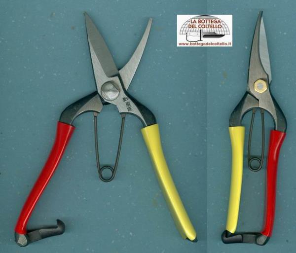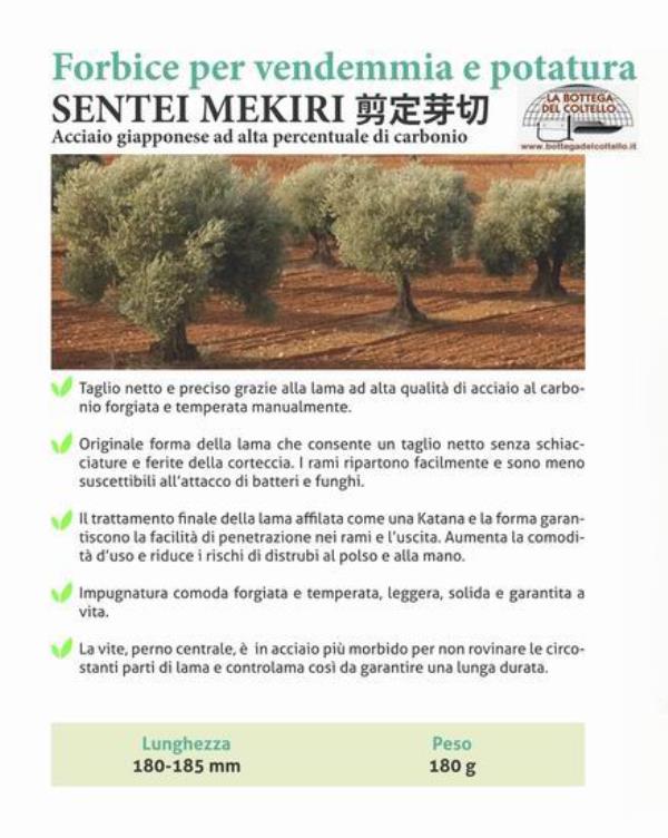 Tobisho Art. Sentei Mekiri Forbice per vendemmia e potatura, è lo strumento ideale per accompagnare i professionisti nei loro lavori di taglio in ogni stagione dell'anno. Colori abbinati studiati per facilitare il ritrovamento della forbice: rosso di giorno, giallo al tramonto. Taglio netto e preciso grazie alla lama ad alta qualità di acciaio al carbonio forgiata e temperata manualmente. Originale forma della lama che consente un taglio netto senza schiacciature e ferite della corteccia. I rami ripartono facilmente e sono meno suscettibili all'attacco di batteri e funghi. Il trattamento finale della lama affilata come una katana e la forma garantiscono la facilità di penetrazione e l'uscita. Aumenta la comodità d'uso e riduce i disturbi al polso e alla mano. Impugnatura comoda forgiata e temperata, leggera, solida e garantita a vita. La vite, perno centrale, è in acciaio più morbido per non rovinare le circostanti parti di lama e controlama così da garantire una lunga durata. Lunghezza 180-185 mm, peso 180 gr, confezione scatola di cartoncino.