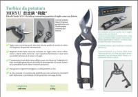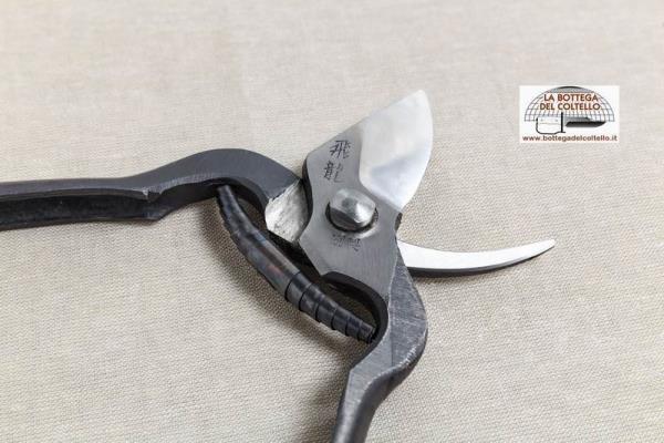Tobisho Art. Hiryu Forbice per potatura Un modello unico al mondo con il taglio netto come una katana. La lama e controlama contattano solo nella parte terminale della punta riducendo in modo significativo l'attrito, lo sforzo delle mani e la loro stessa usura. La penetrazione è più facile per l'assenza del perno. L'ammortizzatore e la forma della lama riducono gli urti alla fine del taglio determinando una riduzione dello sforzo e rispettando mano e polso.