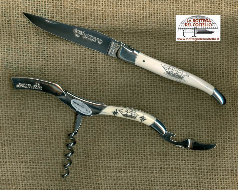 Interamente realizzato da un solo artigiano, Sommelier è stato studiato per rispondere a tutte le esigenze tecniche ed estetiche. Guancette in avorio fossile di mammouth decorato con l'immagine di un veliero. Chiuso mm 120. Peso gr 118. Finitura lucida. Elegante scatola nera.