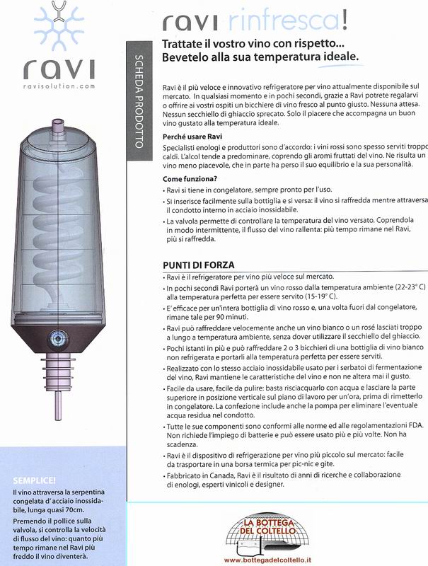 Ravi è un veloce e innovativo refrigeratore per vino: in qualsiasi momento e in pochi secondi, grazie a Ravi potrete regalarvi o offrire ai vostri ospiti un bicchiere di vino fresco al punto giusto. Nessuna attesa. Nessun secchiello di ghiaccio sprecato. Solo il piacere che accompagna un buon vino gustato alla temperatura ideale. Il RAVI non deve essere utilizzato per rinfrescare delle bevande non alcoliche poichè il liquido rischia di congelare nel condotto. Non deve nemmeno essere utilizzato per rinfrescare delle bevande gassate come la birra, lo champagne e gli spumanti.