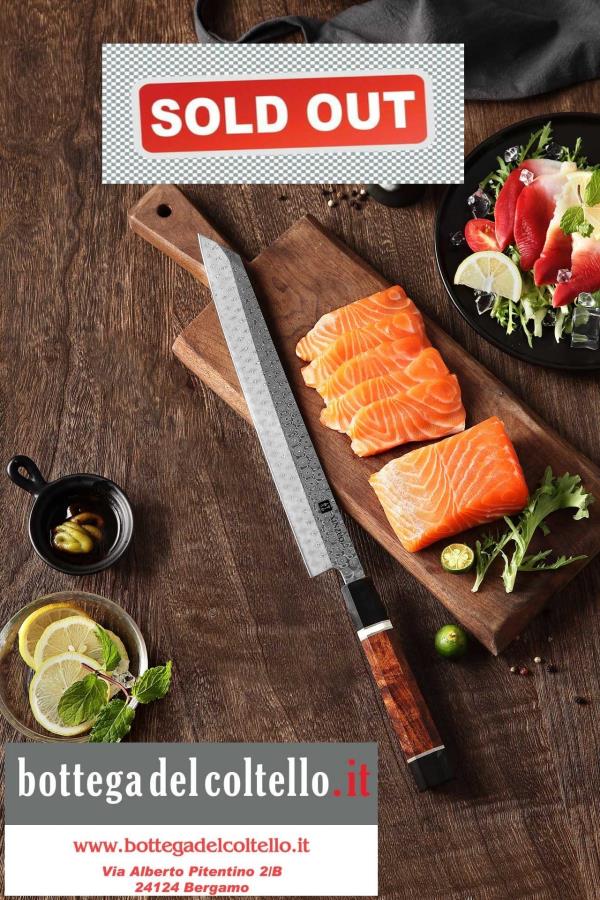 Damasco inossidabile 110 strati con durezza circa 60 Hrc, lunghezza totale mm. 430 lama mm. 270 manico mm. 132 larghezza massima lama mm 34. Manico in legno naturale con fornimenti in metallo e G10 il coltello ha un'affilatura che offre il meglio utilizzato con la mano destra