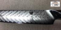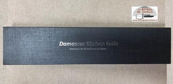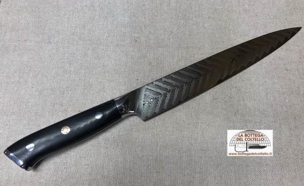 DTYT SWITYF Coltello per affettare. Lama in damasco piuma 67 strati, al cuore acciaio AUS-10V. Manico in G-10 con tre rivetti di cui uno decorato. A tutto codolo. Lunghezza totale mm 340, lama mm 210, peso gr 215. Confezione: scatola di cartoncino.