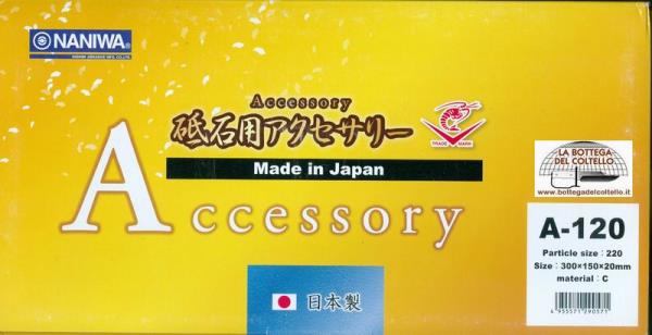 Naniwa art A-120, flattening stone, pietra per rettificare le pietre affilacoltelli. Grit #220. Dimensioni 300x150x20mm. Made in Giappone. Confezione: scatola di cartoncino.