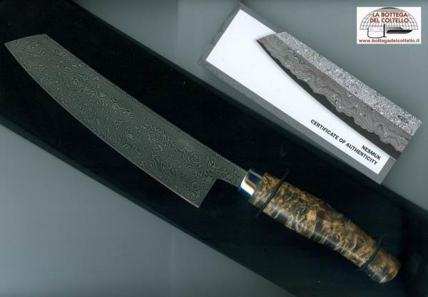 Lama: acciaio Damasco selvaggio lavorato a mano, 200 strati, 61-62 HRC, affilatura leggermente asimmetrica, per uso con mano destra, rivestimento protettivo Nesmuk. Collare: acciaio inossidabile lucidato. Impugnatura: radica di betulla. Confezione: esclusivo cofanetto nero. Incluso certificato di autenticità.