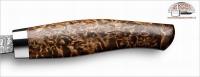 Karelian radica di betulla: • Paese di origine: terra di confine tra Russia e Est-Finlandia • Legno non molto duro ma duraturo, con una densità di 600-700 kg / mc • Legno di colorazione da quasi bianco a bruno-rossastro • Il legno classico dei manici di coltello scandinavi • La bella trama diventa visibile solo dopo elaborata incisione e trattamenti di oliatura.