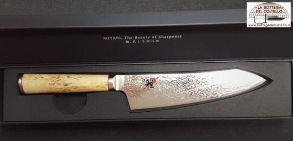 I coltelli della serie Miyabi 5000MCD sono un capolavoro di tecnica, estetica e funzionalità, unitamente al fascino orientale della lavorazione. Sono caratterizzati dalla lama bellissima in damasco inossidabile 101 strati, tagliente in SG2 (metallurgia delle polveri) e dalla raffinata impugnatura in legno di betulla impreziosita da un inserto a mosaico. La parte terminale del manico è decorata con il logo Miyabi. Ogni coltello è rifinito a mano nello stile honbazuke nella fabbrica di Seki, Giappone.