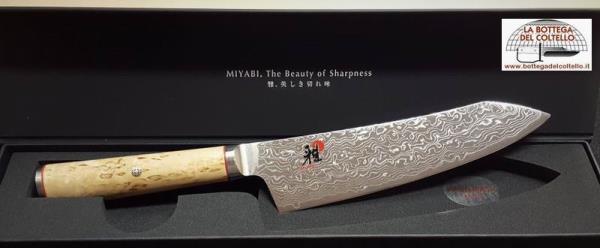 Lama damasco Miyabi 5000MCD inox 101 strati e impugnatura in legno di betulla caratterizzano questo rocking santoku della serie 5000MCD.