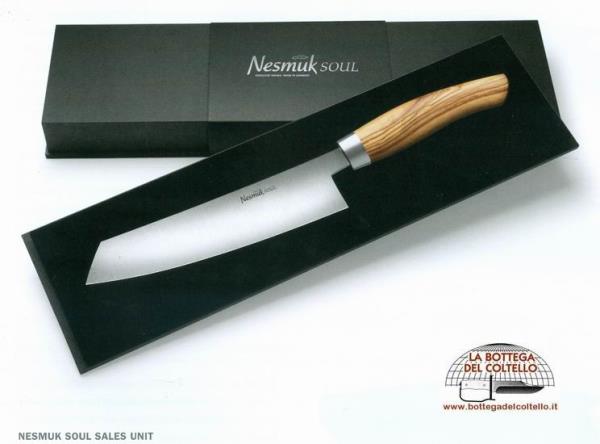 Lunghezza lama mm 180, spessore mm 3. Impugnatura in legno d'olivo proveniente dalla regione mediterranea. L'impugnatura può avere striature naturali diverse da quelle riprodotte nell'immagine. Ogni coltello Nesmuk SOUL ha una confezione sobria ed elegante.