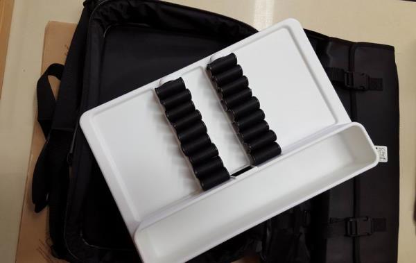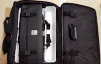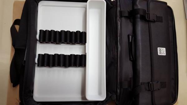 Valigetta - contenitore per coltelli da cucina con lunghezza totale massima di cm 45, un supporto in plastica bianca con posizione predefinita dei coltelli che evita urti. Valigetta aggiuntiva per altri coltelli, da usare anche come supporto per trasporto di piccole quantità di utensili. Non è possibile dare un numero preciso dei coltelli che si possono trasportare perchè molto dipende dalle dimensioni egli stessi, comunque un minimo di 15 coltelli dimensioni medio grandi è garantita.