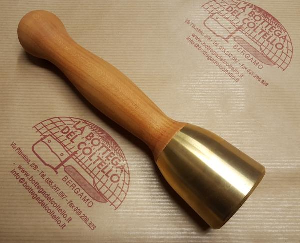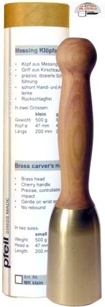 Mazzetta per scultori Pfeil MK klein. Testa in ottone. Impugnatura in legno di ciliegio. Impatto preciso e controllabile. Non rimbalza. Lunghezza mm 190, diametro testa mm 47, peso gr 450.